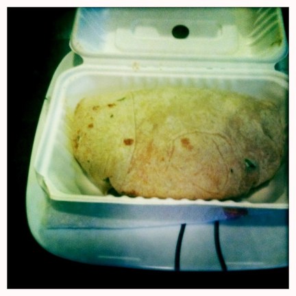 The bad part of this story occurs once the burrito is home… I want to say I tried to stop myself from eating it all, because I did try,I just wasn’t successful. On weight watchers I count my burrito for a set number of points no matter what the size (which is exactly why I have an inappropriate meltdown if they skimp). I was like a puppy who just broke into the treat cabinet and I gorged myself. See, when you are constantly watching your proportions you are never able to realize that super-full bloated feeling that hurts so good and this was an opportunity I wasn’t going to miss. I must say, when you put a truck load of every ingredient, it all comes together quite beautifully. It was delicious and I still managed to lose weight this week, so I guess that means it was actually only 15 points… I hope I get that guy again next time.