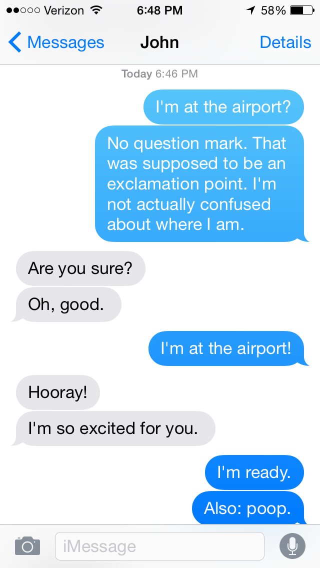 I can’t make this stuff up. My eyes darted around to see if anyone witnessed my crash and when I saw that no one had I gave all my weight to the door having to fight against the failed mechanism. I am flying Air France, a decision I potentially regret because in the line to check my bag the French flight attendant was cold and rude, although pretty. A man behind me was yelling something in French that I now assume was, “Move you stupid American! Also: I hate your infinity scarf and everything you stand for.” I don’t know how I was in the way just standing on the line but somehow I was.